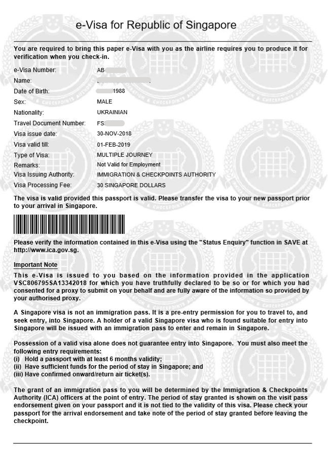 Эта электронная виза Сингапура позволяет совершать въезд в страну в течении срока действия визы (как правило в течении 5 недель) но не превышая лимит пребывания (как правило 30 дней). Будьте внимательны, что срок каждого безвыездного пребывания в Сингапуре составляет не более 30 дней, т.е. при каждом въезде в паспорт ставится штамп о разрешении на пребывание, как правило, в течение 30 дней.